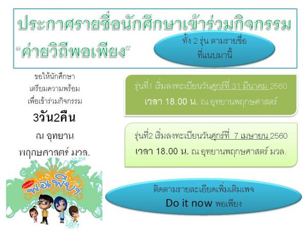 ประกาศ รายชื่อนักศึกษาที่ได้เข้าร่วม “ค่าย Do It Now พอเพียง” ทั้ง 2 รุ่นข่าวประชาสัมพันธ์ / มีนาคม 20, 2017 / By ชัชพล ยิ่งดำนุ่น ตรวจสอบรายชื่อ ได้จากเอกสารแนบ ประกาศรายชื่อรุ่น1 ประกาศรายชื่อรุ่น2 สอบถามรายละเอียดเพิ่มเติมได้ที่ เพจ Do It Now พอเพียง