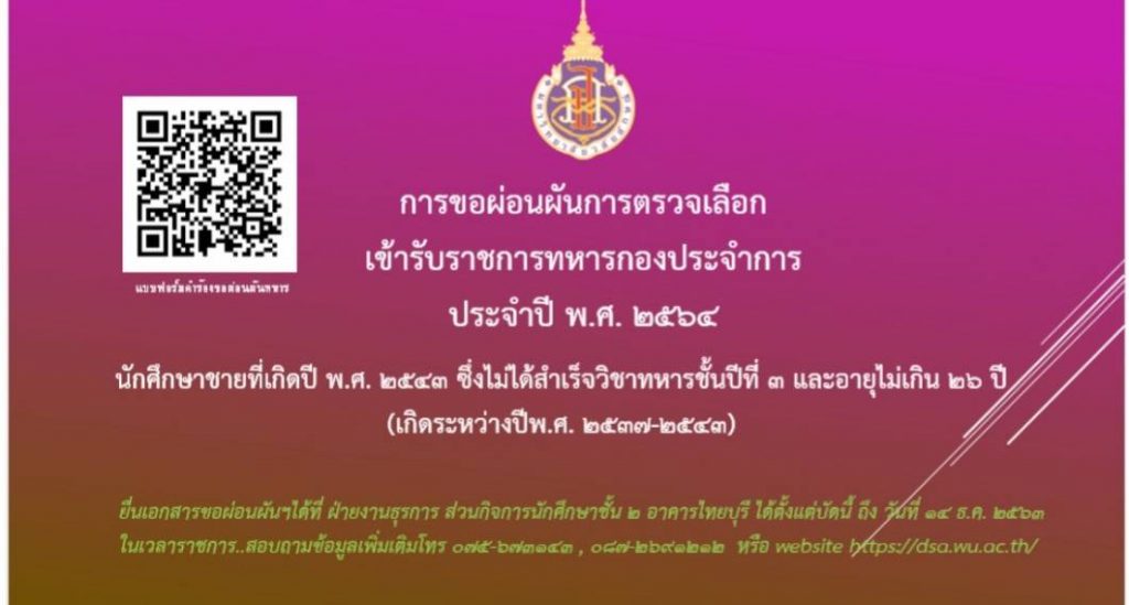 นักศึกษาชายที่เกิดปี พ.ศ. 2543 ซึ่งไม่ได้สำเร็จวิชาทหาร ชั้นปีที่ 3 และอายุไม่เกิน 26 ปี (เกิดระหว่างปี พ.ศ. 2537-2543) ขอให้นักศึกษายื่นเอกสารขอผ่อนผันการตรวจเลือกเข้ารับราชการทหารกองประจำการ ประจำปี 2564 ได้ที่ คุณอรุณรัตน์ วงค์ลิ่ม (พี่ปอม) ฝ่ายธุรการ ส่วนกิจการนักศึกษา ชั้น 2 อาคารไทยบุรี ได้ตั้งแต่บัดนี้ ถึง 14 ธันวาคม 2563 ในเวลาทำการ
