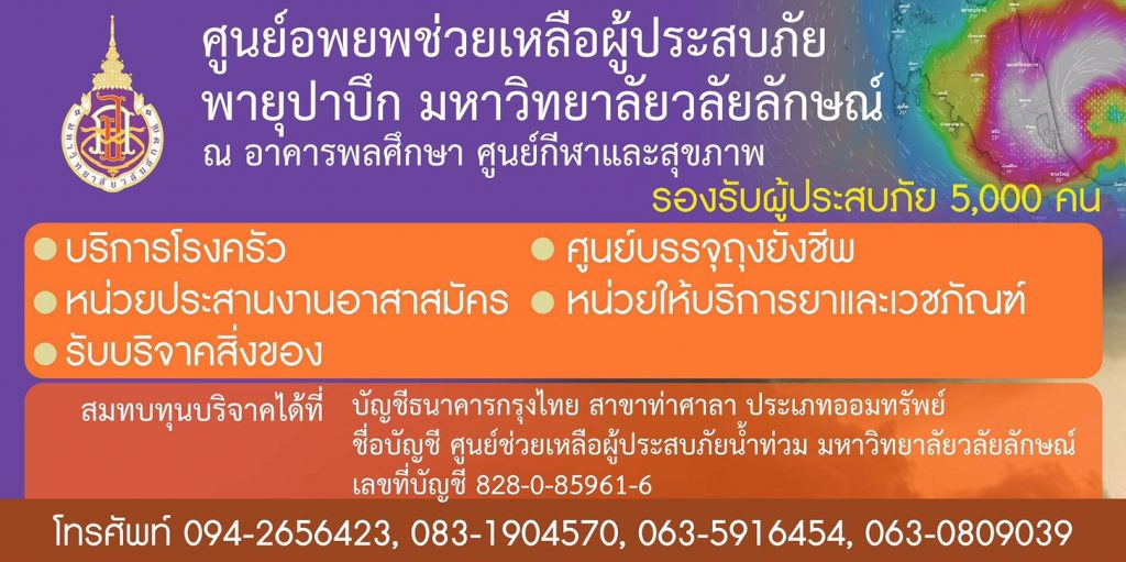 “มหาวิทยาลัยวลัยลักษณ์เล็งเห็นถึงความสำคัญและจำเป็นในการช่วยเหลือผู้ประสบภัยที่เกิดขึ้นอย่างฉับพลัน ซึ่งการให้ช่วยเหลือผู้ประสบภัยดังกล่าวนั้นต้องเป็นไปด้วยความรวดเร็ว และมีประสิทธิภาพทันต่อเหตุการณ์ทั้งนี้สามารถติดต่อศูนย์อพยพช่วยเหลือผู้ประสบภัย พายุปาบึก มหาวิทยาลัยวลัยลักษณ์ ณ อาคารพลศึกษา ศูนย์กีฬาและสุขภาพ หมายโทรศัพท์ 094-2656423, 083-1904570, 063-5916454, 063-0809039 ” ศาสตราจารย์ ดร.สมบัติ กล่าว