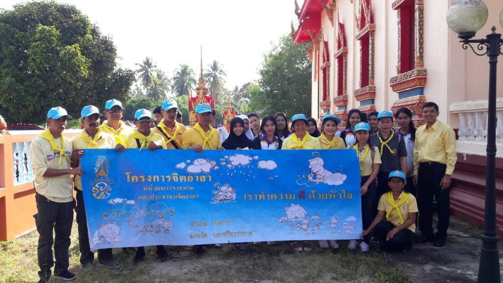 นักศึกษามหาวิทยาลัยวลัยลักษณ์ ร่วมกิจกรรมจิตอาสา โครงการอำเภอเคลื่อนที่ ตามโครงการจิตอาสา หน่วยพระราชทานและประชาชนจิตอาสา อำเภอท่าศาลา จังหวัดนครศรีธรรมราช ณ วัดชัยธารามประดิษฐ์ ตำบลโมคลาน อำเภอท่าศาลา จังหวัดนครศรีธรรมราช โดยร่วมกับภาคส่วนต่างๆ ทั้งนักเรียนและประชาชนจิตอาสาอำเภอท่าศาลา วันที่ 28 มกราคม 2562 ตั้งแต่เวลา 8.00 น.